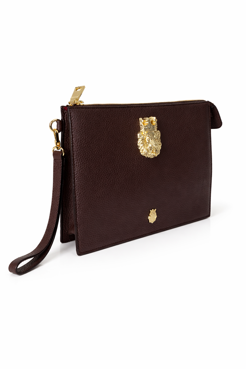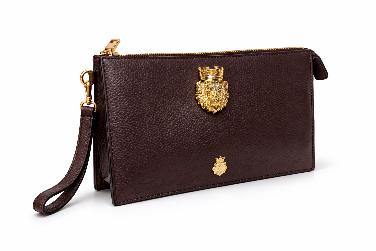 At the center sits the iconic crowned lion emblem — a bold symbol of strength, resilience, and kingship. Finished with polished gold hardware and a detachable wrist strap, this piece transitions seamlessly from executive meetings to elevated evening affairs.